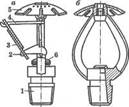 Замки стандартных спринклерных оросителей и контрольные клапаны дренчерных установок рассчитаны на температуру разрушений 72, 93, 141, 182 и 240 °С в зависимости от соответствующей максимальной температуры окружающего воздуха tmax для защищаемого помещения < 50, 50...70, 71.,.100, 101...140, 141...200°С. В обычное время клапан сшгинклера закрывает выход водному раствору пенообразователя и удерживается в этом положении двумя замками с легкоплавким припоем. При расплавлении замка клапан отбрасывается и раствор выходит из насадки и разбрызгивается от отражающих плоскостей распылителя. Воздух подсасывается через отверстие в кожухе и смешивается с раствором, в результате чего образуется воздушно-механическая пена.