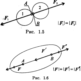 Первая аксиома. Под действием уравновешенной системы сил абсолютно твердое тело или материальная точка находятся в равновесии или движутся равномерно и прямолинейно (закон инерции). Вторая аксиома. Две силы, равные по модулю и направленные по одной прямой в разные стороны, уравновешиваются (рис. 1.2). Третья аксиома. Не нарушая механического состояния тела, можно добавить или убрать уравновешенную систему сил (принцип отбрасывания системы сил, эквивалентной нулю) (рис. 1.3).