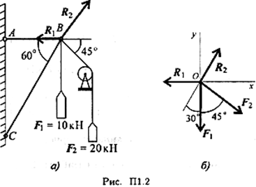 1. Определяем вероятные направления реакций (рис. П1.2а). Мысленно убираем стержень АВ, при этом стержень СВ опускается, следовательно, точка В отодвигается от стены: назначение стержня АВ — тянуть точку В к стене. Если убрать стержень СВ, точка В опустится, следовательно, стержень СВ поддерживает точку В снизу — реакция направлена вверх. 2. Освобождаем точку В от связи (рис. П1.26). 3. Выберем направление осей координат, ось Ох совпадает с реакцией R1. 4. Запишем уравнения равновесия точки В: