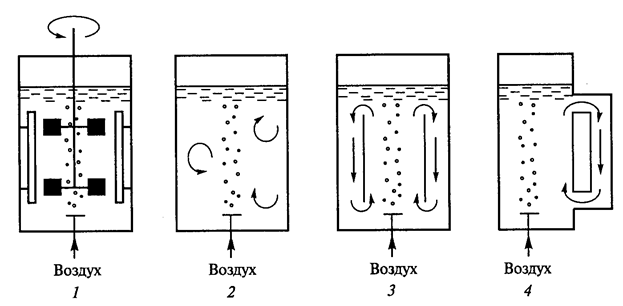 Рис. 12. Схема работы основных типов биореакторов (Т.А.Егорова и соавт., 2003): 1) биореактор с механическим перемешивающим устройством; 2) барботажный биореактор; 3) аэролифтный биореактор; 4) биореактор с вынесенной циркуляционной петлей Биореакторы делят на три основных группы (рис.12): - реакторы с механическим перемешиванием; - барботажные колонны, через которые для перемешивания содержимого пропускается воздух или другой газ; - аэролифтные (эрлифтные) реакторы с внутренней или внешней рециркуляцией; перемешивание и циркуляция культуральной среды в них обеспечивается потоком газа (обычно воздуха), за счет которого между верхним и нижним слоями культуральной среды возникает градиент плотности. Чаще всего используются биореакторы с механическим перемешиванием, поскольку они имеют следующие преимущества: - позволяют легко менять технологические условия; - всегда есть в продаже; - обеспечивают эффективную доставку газа к растущим клеткам (если говорить на инженерном языке, обладают высоким объемным коэффициента массобмена); - имеется большой опыт их промышленного использования с соответствующей регламентационной литературой. В реакторах с механическим перемешиванием газ (как правило, воздух) подают в культуральную среду под давлением через разбрызгиватель – кольцо с множеством маленьких отверстий либо трубку с одним отверстием. В первом случае образуются мелкие пузырьки воздуха и обеспечивается их более равномерное распределение, однако разбрызгиватели в виде трубок используются чаще, поскольку они реже закупориваются. Для равномерного распределения газа по всему объему биореактора используются мешалки – одна или несколько. Они разбивают крупные пузырьки воздуха, разносят их по всему реактору и увеличивают время пребывания в культуральной среде. Многие культуральные среды агрессивны, поэтому стенки биореакторов делают из нержавеющей стали. Стеклянные части используют только в лабораторных биореакторах емкостью менее 50 л. Размер биореактора лимитируется его способностью эффективно отдавать тепло, выделяемое микроорганизмами в ходе метаболизма и высвобождаемое в результате перемешивания. Известно, что, ассимилируя 1 кг сахара, микроорганизмы выделяют 4-6 тысяч кДж тепла. Обеспечение стерильности, постоянства рН и температуры – ключевые требования при любом способе культивирования независимо от конструкции биореактора. В молекулярной биотехнологии биореакторы с механическим перемешиванием используются в меньшей степени из-за грубого воздействия на клетки: - клетки рекомбинантных микроорганизмов более хрупки, чем нетрансформированные клетки, поскольку часть их энергетических ресурсов расходуется на синтез чужеродных белков и в результате образуется менее прочная клеточная стенка; - самый распространенный ответ клетки на внешнее воздействие – уменьшение количества синтезируемых белков, в том числе и рекомбинантных; - под действием сдвиговых эффектов могут изменяться физические и химические свойства клеток, что затруднит дальнейшую работу с ними, например, может увеличиться количество полисахаридов на поверхности клеток (это приведет к ухудшению условий их выделения и лизиса, а также затруднит очистку рекомбинантного белка). Рекомбинантные микроорганизмы широко используются для получения разноо