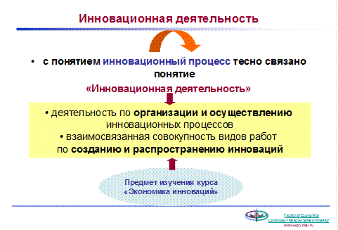 Й.Шумпетером сформулированы основные положения теории инноваций и теории предпринимательства, раскрывающие сущность инноваций и новую роль предпринимателя в инновационном процессе. «Инновации – это одновременное проявление двух миров, а именно мира техники и мира бизнеса» [8]. Когда изменение происходит только на уровне технологии, Й.Шумпетер называет его изобретением, а когда к изменениям подключается бизнес, они становятся инновациями. Образно говоря, с точки зрения Й.Шумпетера, инновация –это встреча идеи и предпринимателя.