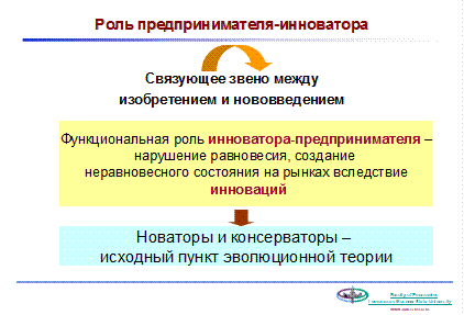 В соответствии со взглядами Й.Шумпетера, предприниматель-инноватор является связующим звеном между изобретением и нововведением, а его деятельность способствует качественному изменению развития экономики[9]. Функциональная роль инноватора-предпринимателя в экономике сводится к нарушению равновесия, созданию неравновесного состояния на рынках вследствие инноваций, что и приносит ему, помимо предпринимательской прибыли, дополнительные сверхдоходы, получившие в современной науке название «инновационной ренты» и «инновационной квазиренты»[10]. Слайд из лекции: