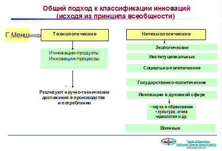Различные типы и виды инноваций имеют свои особенности разработки, реализации и распространения и, соответственно, требуют специфических подходов к управлению инновационной деятельностью. Следовательно, вопрос о классификации инноваций носит не только теоретический, но и значительной мере – практический характер. Именно поэтому в основе управления инновациями должна лежать типология инноваций, их классификация по различным существенным основаниям, критериям, параметрам. Исходя из принципа всеобщности инновации в самом общем виде делятся на технологические и нетехнологические (Г.Менш). Слайд из лекции: