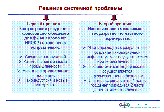 Президентом России утверждены приоритетные направления развития науки, которые являются вектором, направлением движения, а бизнесу предлагается стать партнером в их реализации на практике. Например, на нанотехнологии бюджет выделил не меньше средств, чем в самых богатых странах, но на Западе эта отрасль получает еще столько же от частных компаний, а в России этот источник отсутствует, российский бизнес активно не вкладывается в инновации (особенно в условиях финансового кризиса). Именно поэтому необходим механизм налаживания государственно-частного партнерства.