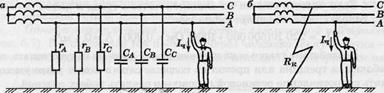 Таким образом, протяженные электрические цепи промышленных предприятий большой емкости обладают высокой опасностью, даже при хорошей изоляции фаз. В аварийном режиме работы (рис. 3, б) ток, проходящий через тело человека, прикоснувшегося к исправной фазе, будет стекать по цепи замыкания на земле на аварийную фазу, и его величина