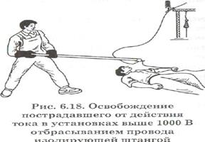 Первая помощь пострадавшему от электрического тока делится на несколько этапов: 1) освобождение пострадавшего от воздействия электрического тока; 2) определение состояния пострадавшего; 3) проведение искусственного дыхания и непрямого массажа сердца. Для освобождения пострадавшего от воздействия электрического тока следует отключить электроустановку от питающего напряжения с помощью органов отключения: кнопок, рубильников, выключателей; если это сделать невозможно, то необходимо вывернуть пробочные предохранители или перерубить провода острыми предметами, имеющими изолирующие рукоятки. Если провод лежит на пострадавшем, то следует воспользоваться любым нетокопроводящим предметом (сухой палкой, доской), для того чтобы снять провод с пострадавшего и отбросить его в сторону. Если человек попал под воздействие электрического тока, находясь на опоре, то для прекращения действия тока на токоведущие провода можно набросить предварительно заземленный провод, который вызовет срабатывание защиты и отключение напряжения. В этом случае необходимо предусмотреть мероприятия, предотвращающие падение пострадавшего с опоры. Во многих случаях можно оттащить пострадавшего за одежду, не касаясь руками оголенных частей его тела, чтобы самому не попасть под воздействие электрического тока. Если есть возможность следует предварительно надеть диэлектрические перчатки, галоши. При напряжении до 1000 В для отделения пострадавшего от токоведущих частей можно воспользоваться любыми непроводящими ток предметами: обмотать руку шарфом, оттянуть его за одежду, встать на сверток сухой ткани, сухую доску. Даже голой рукой можно оттянуть пострадавшего за его сухую одежду (рис. 6.17), отстающую от тела (за ворот, хлястик, полу пиджака). Нельзя тянуть за брюки или обувь, которые могут оказаться сырыми или иметь металлические детали, соприкасающиеся с телом. Если пострадавший судорожно сжал провод и оторвать его невозможно, то можно прервать ток, проходящий через пострадавшего, отделив его не от провода, а от земли (подсунув под него сухую доску, оттянув ноги сухой веревкой). После этого он легко разожмет руку. Если в установке напряжением более 1000 В быстрое отключение невозможно, то пользоваться какими бы то ни было подручными средствами вроде палки, доски или сухой одежды нельзя. В этом случае необходимо надеть диэлектрические перчатки и боты и оттащить пострадавшего от частей установки, находящихся под напряжением, пользуясь изолирующими защитными средствами, рассчитанными на это напряжение (рис. 6.18) (штанги, клещи для предохранителей или коврики), либо вызвать автоматическое отключение установки, устроив в ней короткое замыкание на безопасном расстоянии от пострадавшего.