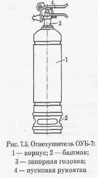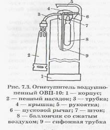 Под действием давления образующаяся пена впрыскивается в зону горения. Химические пенные огнетушители типа ОП-3 или ОП-5 приводятся в действие ударом бойка ударника о твердое основание. При этом разбиваются стеклянные колбы, серная кислота выливается в баллон и вступает в химическую реакцию со щелочью. Образующийся углекислый газ в результате реакции вызывает интенсивное вспенивание жидкости и создает в баллоне давление порядка 9-12 атмосфер, благодаря чему жидкость в виде струи пены выбрасывается из баллона через сопло. Продолжительность действия химических пенных огнетушителей порядка 60-65 с, а дальность струи до 8 м. Воздушно-пенные огнетушители (ОВП-5, ОВП-10) заряжаются 5% водным раствором пенообразователя ПО-1. При приведении в действие огнетушителя сжатая двуокись углерода выбрасывает раствор пенообразователя через пенный насадок, образуя струю высокократной пены (рис. 7.3). Продолжительность действия воздушно-пенных огнетушителей до 20 с, дальность струи пены порядка 4-4,5 м. Углекислотные огнетушители ОУ-2 (рис.7.4) состоят из баллона с углекислотой, запорно-пускового вентиля, сифонной трубки, гибкого металлического шланга, диффузора (раструба-снегообразователя), рукоятки и предохранителя. Запорный вентиль имеет предохранительное устройство в виде мембраны, которое срабатывает при повышении давления в баллоне сверх допустимого. Газ в баллоне находится под давлением порядка 70 атмосфер (6-7 МПа) в жидком состоянии. Огнетушители приводятся в действие при вращении запорного вентиля против часовой стрелки. При открытии вентиля углекислый газ выходит наружу в виде снега. При повышении окружающей температуры давление в баллоне может достигать 180-210 атмосфер (180 - 210-Ю5 Па).