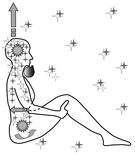 Выполняя скручивание, необходимо визуализировать, как каждый позвонок в отдельности отрывается от пола. Представляйте, как вы нанизываете позвонки, как бусы на нить, один за другим. Помните: ваша цель не подняться, а именно скрутиться. Представляйте, как увеличивается расстояние между позвонками для межпозвонковых дисков и ваш позвоночник удлиняется. Ощущайте, как на вдохе энергия поднимается вдоль позвоночника к макушке. Ощутите, как жизненная энергия ци, струящаяся вдоль позвонков, проникает в них. Наполните ваши позвонки и межпозвоночные диски живительной энергией и любовью. Если вы не успели выполнить скручивание на одном вдохе, то сделайте выдох, пропуская энергию через все органы, и снова вдохните, опять направив жизненную ци вверх к макушке. 3. Подняв корпус до вертикального положения (рис. 12), вытянитесь вверх, удлиняя позвоночник. Проверьте веревочку, привязанную к макушке, «подтяните» ее. Ощутите, как разглаживаются складочки на шее. Установите «яблоко» между грудью и подбородком. Опустите плечи вниз. Втяните живот, пристегните «пуговку» к спине. Подкрутите копчик. Если вы скручивались с прямыми ногами, то их можно согнуть и прижать стопы к полу.