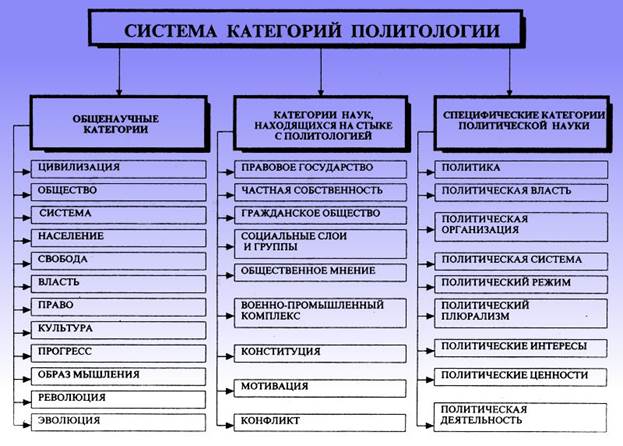 Политология, как и любая другая наука, использует как общенаучные категории, так и категории наук, находящихся на стыке с её объектной областью, а также свой собственный (специфический) категориальный аппарат. 1) Общенаучные категории, т.е. категории, используемые большинством социально-экономических и гуманитарных наук: цивилизация, культура, общество, население, власть, народ, прогресс, свобода, революция, эволюция, военное строительство, право, образ мышления и другие. 2) Категории наук, находящихся на стыке с политологией: правовое государство, частная собственность, гражданское общество, социальные слои и группы, общественное мнение, военно-промышленный комплекс, военно-политические институты, социальные слои и группы, профессиональная армия, военно-политические конфликты и другие. 3) Собственные (специфические) категории: политика, политическая власть, политическая система, политическая организация, политический режим, политический плюрализм, политические интересы, политические ценности, политическая деятельность и другие. Классифицировать наиболее используемые категории политологии можно и по следующим основаниям: -категории, отражающие динамизм политической жизни: политический интерес, политический выбор, политическое развитие, политическая ситуация; -категории, отражающие взаимодействие динамизма и стабильности политической жизни: политическая власть, политический процесс, политические изменения; -категории, отражающие стабильность политической жизни: политическая структура, политический режим, политическая организация, политическая система.