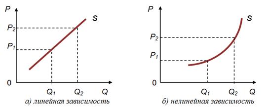 Рыночное поведение производителей (продавцов) товаров и услуг характеризуется понятием «предложение», которое отражает готовность производителей (продавцов) производить и продавать свои товары на рынке по определённым ценам в определённый период времени. Предложение (supply) – это желание и готовность производителей (продавцов) предложить к продаже свои товары. Предложение количественно измеряется величиной предложения. Величина предложения – это количество товаров и услуг, которое производитель желает и способен продать по данной цене в определённый момент времени. В экономической теории различают индивидуальное и рыночное предложение. Индивидуальное предложение – это предложение товара отдельным производителем (продавцом). Рыночное предложение – это суммарное предложение всех продавцов на данном рынке. Объём рыночного предложения определяется количеством производителей, уровнем цен на товары, уровнем налогообложения и иными факторами. Цена предложения – это минимальная цена, по которой продавец согласен продать определённое количество данного товара в определённый момент времени на данном рынке. К факторам (детерминантам), определяющим предложение, относятся: · цена товара (Р); · технология производства (КТ); · издержки производства, определяемые ценой используемых факторов производства (РF); · налоги (T) и субсидии (Н); · ожидания производителей (W); · количество производителей (N); · цены на другие товары (Pn); · прочие факторы (B). С учётом всех этих факторов общую функцию предложения можно представить в следующем виде: QS = f (Р,KТ, PF, T, Н, W, N, Pn, B). Функция предложения – количественная зависимость между величиной предложения и определяющими его факторами (детерминантами). Если допустить, что все неценовые факторы для рассматриваемого периода являются неизменными, то можно перейти к функции предложения от цены: Qs = f(Pi), где QS — величина предложения на товар i; Pi — цена анализируемого товара i. Графическое изображение зависимости величины предложения от рыночной цены осуществляется с помощью кривой предложения. Кривая предложения – представленная в графической форме зависимость между величиной предложения товара на рынке и ценой этого товара при неизменных прочих (неценовых) факторах, влияющих на предложение. На кривой предложения по вертикали отображаются Р – возможные цены, а по горизонтали Q – количества предлагаемого к продаже товара. Зависимость предложения от цены может быть линейной (рис.4.2.1, а) или нелинейной (рис.4.2.1, б).