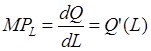 где Q1, Q2 — два последующих значения совокупного продукта (объёма выпуска); L1, L2 — соответственно, два последовательных значения переменного ресурса (труд). 2) непрерывный предельный продукт (когда известна производственная функция):