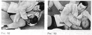 Узел наружу: если противник пытается уйти с удержания, упираясь в подбородок, необходимо перехватить его руку за запястье рукой со стороны головы и отвести ее в сторону, второй рукой из-под локтя атакуемой руки захватить запястье своей руки. Приподнять плечо противника вверх, прижимая его предплечье к ковру (рис. 94, 95). Если противник выпрямляет атакуемую руку, необходимо сделать ему рычаг локтя, перегибая руку через предплечье (рис. 96). Если только есть возможность захватить руку противница рукой со стороны ног, то второй рукой необходимо захватить запястье своей руки из-под локтя противника. Приподнимая плечо противника, отвести предплечье его руки вниз и сделать узел руки внутрь (рис. 97).
