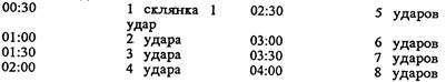 И совершенно идентично в течении каждой вахты. Вызов "один удар" используется для вызова следующей вахты за 15 минут до начала ее. Примечание: На Российских судах "собачья вахта" - время 04:00 - 08:00, на немецких - 24:00 - 04:00.