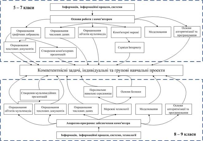 Рис. 1. Змістові залежності між темами курсу інформатики Зміст навчального предмета «Інформатика» містить фундаментальну складову, яка реалізується шляхом вивчення основ науки «Інформатика», має прикладну спрямованість, що реалізується під час виконання запланованих відповідних тематичних практичних робіт, розв‘язання компетентнісних задач, виконання індивідуальних і групових навчальних проектів. Опанування змістом навчального матеріалу з інформатики забезпечується застосуванням різних форм (індивідуальної, парної, групової й колективної) організації діяльності учнів та інноваційних методів навчання. Виконання учнями практичних завдань на комп’ютері є важливою складовою уроку інформатики. Їх мета може бути різною: формування позитивної мотивації та актуалізація знань; формування вмінь, навичок і здібностей; поточне оцінювання навчальних досягнень учнів тощо. Зміст таких завдань треба добирати так, щоб тривалість їх виконання не перевищувала 25 хвилин (згідно з санітарними нормами щодо тривалості безперервної роботи за комп’ютером учнів цієї вікової категорії). Практичні роботи, вказані в програмі, є обов’язковими для оцінювання всіх учнів класу. Учитель може самостійно визначати форму проведення цих робіт (лабораторні роботи, практикуми, навчальні проекти, колективна робота в Інтернеті тощо). У 7, 8 і 9 класах програмою передбачено години на розв’язування компетентнісних задач, які є однією з важливих ділянок роботи в системі навчання інформатики. Розв’язування компетентнісних задач зазвичай передбачає сім етапів діяльності учнів: · визначення, ідентифікація даних: учень розуміє умову задачі, правильно ідентифікує поняття, деталізує запитання, знаходить у тексті задачі відомості та дані, які задані в явному чи неявному вигляді; · пошук даних: учень формує стратегію розв’язування задачі, планує свою роботу при виконанні завдання, добирає умову пошуку для розв’язування завдання, співставляє результати пошуку із метою, здійснює пошук даних в Інтернеті); · управління: учень структурує потрібні дані для пошуку розв’язку; · інтеграція: учень порівнює і співставляє відомості із кількох джерел, виключає невідповідні та несуттєві відомості та вчасно зупиняє пошук. · оцінка: учень правильно шукає відомості у базі даних, вибирає ресурси згідно з сформульованими чи запропонованими критеріями; · створення: учень враховує особливості призначення підсумкового документа, добирає середовища опрацювання даних, стисло і логічно грамотно викладає узагальнені дані, обґрунтовує свої висновки; · передавання повідомлень: учень у разі потреби архівує дані, адаптує повідомлення для конкретної аудиторії, створює підсумковий документ акуратно та презентабельно. При проектуванні компетентнісних задач слід врахувати, що в 7 класі опрацювання даних учнями повинно здійснюватися за допомогою однієї технології або в одному середовищі, у 8 класі - двох технологій або в двох середовищах, у 9 класі – кількох технологій або в кількох середовищах. Учитель самостійно добирає кількість і зміст компетентнісних задач. Оцінювання компетентнісних задач є обов’язковим і для всіх учнів класу. Навчальні індивідуальні та групові проекти орієнтовані на самостійну діяльність учнів – індивідуальну, парну чи групову. В процесі виконанн