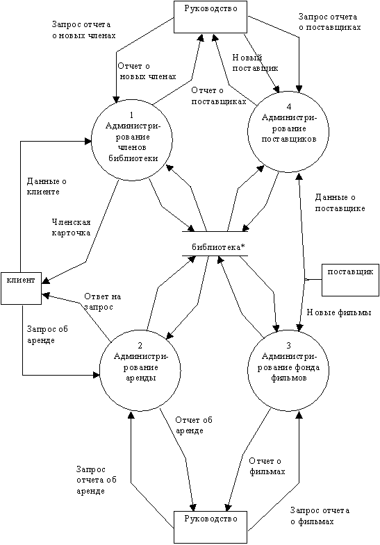 Назначение ИС определяет соглашение между проектировщиками и заказчиками относительно назначения будущей ИС, общее описание ИС для самих проектировщиков и границы ИС. Назначение фиксируется как текстовый комментарий в "нулевом" процессе контекстной диаграммы. Например, в данном случае назначение ИС формулируется следующим образом: ведение базы данных о членах библиотеки, фильмах, аренде и поставщиках. При этом руководство библиотеки должно иметь возможность получать различные виды отчетов для выполнения своих задач. Перед построением контекстной DFD необходимо проанализировать внешние события (внешние объекты), оказывающие влияние на функционирование библиотеки. Эти объекты взаимодействуют с ИС путем информационного обмена с ней. Из описания предметной области следует, что в процессе работы библиотеки участвуют следующие группы людей: клиенты, поставщики и руководство. Эти группы являются внешними объектами. Они не только взаимодействуют с системой, но также определяют ее границы и изображаются на начальной контекстной DFD как терминаторы (внешние сущности). Начальная контекстная диаграмма изображена на рисунке 2.42. В отличие от нотации Gane/Sarson внешние сущности обозначаются обычными прямоугольниками, а процессы - окружностями.