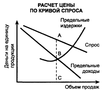 Рис. 18.1 На таком графике представлены общие издержки и ожидаемые общие поступления при разных уровнях объема продаж. Независимо от объема сбыта постоянные издержки находятся на одном уровне. Валовые издержки как сумма постоянных и переменных издержек растут одновременно с ростом сбыта. Крутизна наклона кривой валовых поступлений зависит от цены товара. После преодоления точки безубыточности (пересечения кривой валовых поступлений с кривой валовых издержек) фирма начнет получать целевую прибыль. Таким образом, при определенной цене для обеспечения безубыточности, т.е. покрытия валовых издержек поступлениями, фирма должна продать товарных единиц, как минимум, до точки безубыточности. Если фирма готова взимать за свой товар более высокую цену, то для получения целевой прибыли ей не обязательно продавать так много единиц товара. Однако при более высокой цене рынок, возможно, не захочет закупить даже меньшее количество товара. Многое зависит от эластичности спроса по ценам, чего график безубыточности не отражает. Преимущества метода: возможность планирования фирмой получения целевой прибыли при различных ценах на товар: простота моделирования процесса ценообразования. Недостатки метода: сложность оценки вероятности влияния разных уровней цен на объем сбыта; многовариантность подхода. Конечно, желательно, чтобы рассчитываемая цена покрывала себестоимость и целевую прибыль. Однако, если она была определена вне связи с изменениями и требованиями спроса, который отражает покупательную способность целевого рынка, то это обстоятельство может стать причиной провала предварительно построенных планов финансовой деятельности фирмы и не дать возможности получить целевую прибыль. В случае ценовой эластичности спроса, когда спрос на товары чутко реагирует на изменение цены, продавец стремится определить цену в районе точки совпадения предельных доходов и расходов, т.е. на уровне, обеспечивающем достижение максимально возможной прибыли. Для этой точки можно оценить объемы продажи, цену товара на данное время. Проиллюстрируем это на графике расчета цены по кри вой спроса (рис. 18.2). Отметим, что по оси ординат на графике отложены удельные издержки, доходы и спрос на единицу продукции. Как показано на графике, если фирма увеличивает объем продаж на некоторую величину, то получает увеличение предельных доходов в качестве дополнительной прибыли. Но при этом нельзя избежать возникновения предельных расходов, которые являются дополнительными затратами. Следовательно, в той части графика, где прямая предельных доходов идет выше кривой предельных издержек, присутствует прямая зависимость роста прибылей от роста продаж. Однако, если отношения обратные, то прибыль “съе- М 257 дается”, поэтому точка пересечения этих кривых В становится точкой, обеспечивающей максимальную прибыль.