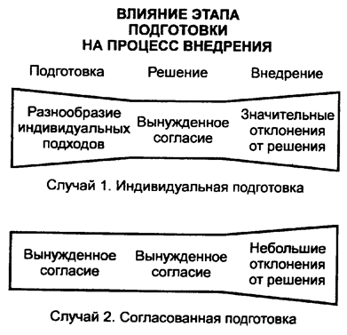 Внедрение маркетинговой стратегии и мероприятий всего комплекса маркетинга - это кульминация совместных усилий консультанта и клиента С точки зрения клиента, внедрить изменения, ведущие к реальным улучшениям - основная цель любого консультационного задания. Консультант также желает, чтобы о его предложении не только хорошо говорили, но и претворяли в жизнь с хорошими результатами. Выделим несколько практических рекомендаций по внедрению результатов маркетингового аудита на предприятии. Во-первых, люди, затрагиваемые процессом изменений, должны вовлекаться в этот процесс как можно раньше, чтобы идентификация изменений и их внутреннее принятие были охвачены полнее. Однако, чтобы добиться такого эффекта, следует учитывать один важный психологический момент Любой из участников процесса изменений может посещать встречи или “мозговые атаки” для конкретных целей (например, получения идей для решения творческих задач), но не должен начинать использовать для этого собственные методы, если вы хотите выработать наилучший метод для общего применения. Практические результаты показывают, что когда человека поощряют применять собственные подходы, а наилучший метод или одобренное решение привносят позднее, даже при желании следовать новому предложению он в конечном итоге будет значительно отклоняться от одобренного метода, следуя собственному Однако, если человек сначала знакомится с наилучшим методом или одобренным решением в группе, впоследствии он, как правило, лишь очень незначительно отклоняется от установленного порядка. Влияние этапа подготовки на процесс внедрения может быть проиллюстрировано результирующими диаграммами двух различных случаев индивидуальной подготовки и согласованной подготовки (рис.20.4):