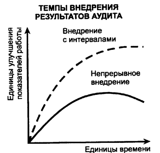 Рис. 20.4 В случае индивидуальной подготовки конечный результат показывает, что человек действует, значительно отклоняясь от согласованного метода, хотя эти расхождения могут быть и не столь велики, как при первоначальной подготовке. Во втором случае можно отметить меньше отклонений от одоб- ренной нормы, так как у отдельных лиц не было возможности испытать какой либо иной подход, кроме одобренного. Таким образом, если это возможно, консультант должен пытаться внедрять одобренную стратегию как схему, относящуюся ко всей группе, когда индивидуальные различия сведены к минимуму. Часто это происходит в результате давления основной группы в сочетании с отсутствием возможности для выработки индивидуальных решений. Во-вторых, показатели работы фирмы улучшаются быстрее, сильнее и на более долгий срок, если новые методы вводятся относительно быстро с последующими периодами отдыха, а не непрерывно и массированно. Общее повышение эффективности работы, как показано на следующем рисунке, отмечается при использовании тактики “быстро и часто” в сравнении с практикой непрерывного внедрения (рис. 20.5).