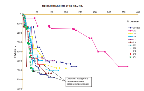 В ходе работ ОАО «НК «Роснефть-Сахалин- морнефтегаз» приобрел ценный опыт проводки наклонно-направленных скважин со сверхдальним отходом от вертикали, почерпнуть который из технической литературы невозможно (подобные материалы не публикуются) и который значительно улучшил ТЭП строительства скважин (рис. 10).