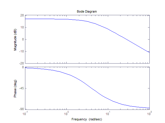 4. Построим графики ЛЧХ и АФХ исследуемого звена. Для этого в окне Command window набираем >> t=tf([7],[0.25 1]),нажимаем Enter, после чего появляется искомая функция Transfer function: ---------- 0.25s + 1, для построения непосредственно графиков ЛЧХ и АФХ набираем >> нажимаем Enter, получаем график: