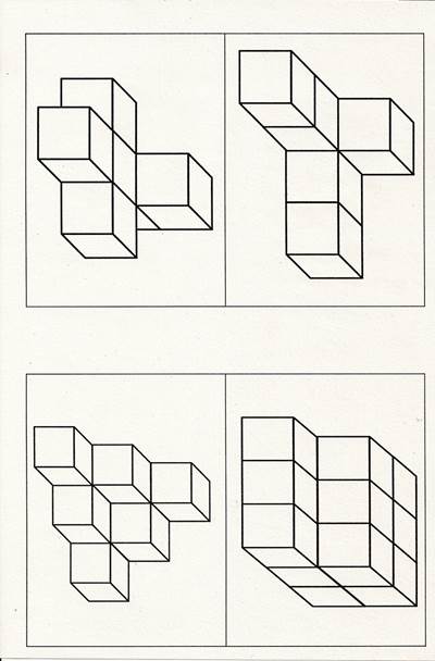 Систематическое овладение понятиями начинается в процессе школьного обучения. Но психологами доказано, что некоторые понятия могут быть усвоены и детьми дошкольного возраста. Но усвоение логических форм мышления будет неполноценным, если у ребенка не развито наглядно-схематическое мышление, которое помогает понимать обобщенные схематические изображения и формировать понятия. Развитое образное мышление дает возможность ребенку соотнести и повторить за взрослым какое-либо действие. Возьмем, к примеру, кубики Никитина (рис.4). Попросите ребенка в точности повторить вашу постройку (не только расположение кубиков, но и их цвета). То, насколько легко (или нелегко) ребенок выполнит эти действия, покажет вам, достаточно ли внимания вы уделяли развитию образного и схематического мышления.