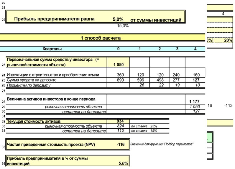 Комментарии к расчетной таблице (представлена ниже) Расчетная таблица состоит из трех частей. Первая содержит исходные данные и предположения, здесь же приведены результаты расчета. Вторая и третья части содержат расчеты эффективности различных моделей поведения инвестора. Для удобства описания таблицы ее строки нумеруются. Рассмотрим по- рядок формирования таблицы на конкретном примере. Исходные данные и Сведение результатов Значения в строках 1 и 2 были выбраны произвольно. При необходимости таблица легко адаптируется для расчета ПП, соответствующей проекту любой длительности и с любым числом платежных периодов в году. Стоимости строительства и земельного участка (строки 3 и 4), а также распределение затрат на строительство по платежным периодам (строка 5) должны быть известны до начала расчета. Так как ПП определяется в процен- тах от величины инвестиций, можно задавать в строках 3 и 4 не конкретные значения, а соотношение стоимостей земли и здания. В первой ячейке строки 5 оценщик может указать размер авансового платежа. В строке 6 оценщик имеет возможность отразить свои представления об изменении стоимости оцениваемого объекта за период, соответствующий про- должительности строительства. При этом предлагаемая методика расчета позволяет не учитывать физи- ческий износ объекта, накопленный за этот период. Таким образом, значение в строке 6 отражает, главным образом, прогнозируемое изменение уровня цен на рынке. В рассматриваемом примере считаем, что стоимость объекта не изме- нится. В строках 9-11 задаются значения ставки по депозиту, нормы отдачи для строительного проекта и ставки дисконта для потока доходов от эксплуатации объекта. В общем случае они должны быть разными. Данная таблица не предполагает изменения ставок за время осуществле- ния проекта, хотя если возникнет такая необходимость, может быть доработана соответствующим образом. В строке 14 перед проведением расчета нужно задать начальные значения ставки ПП для двух вариантов расчета. Можно задать нулевые значения. В предлагаемом примере для наглядности использовалась ставка ПП, равная 5%. После проведения вычислений с использованием функции «Подбор па- раметра» в строке 14 появляются расчетные значения ставок ПП для двух вари- антов расчета. В строке 15 отражается значение рыночной стоимости объекта, которая рассчитывается как (строка 3 + строка 4) х (1+строка 14). Раздел «Сведение результатов» позволяет оценщику путем расстановки весовых коэффициентов выразить свое отношение к достоверности результа- тов, полученных на основе двух вариантов расчета. Первый способ расчета Данный способ расчета основан на следующем утверждении: для того, чтобы имело смысл инвестировать в строительный проект, показатель NPV такого проекта должен быть положительным. В строке 23 показана первоначальная сумма средств у инвестора, которая в соответствии с указанным выше допущением принята равной рыночной стои- мости объекта (строка 15). В строке 24 указаны суммы инвестиций в строительство в соответствии с определенным выше графиком. Затраты на приобретение земельного участка и авансовый платеж за строительство производятся в начальный момент (нулевой период в таблице). Как уже отмечалось, предполагается, что временно не задействованные средства инвестор разместит на депозит. В 