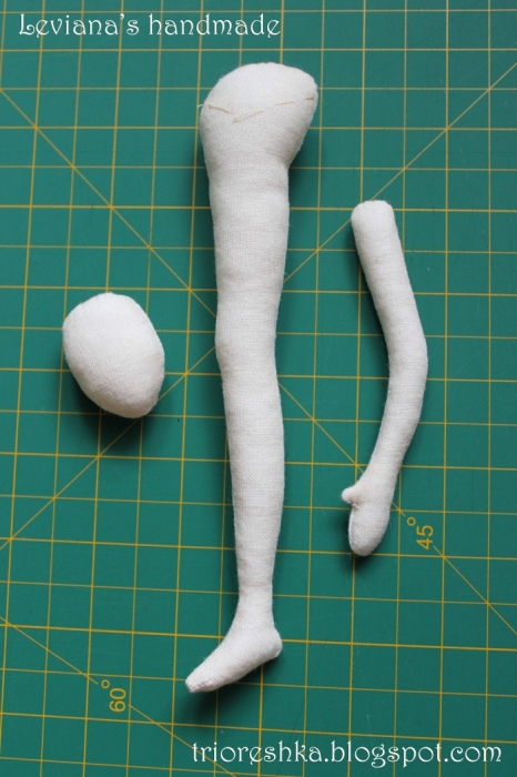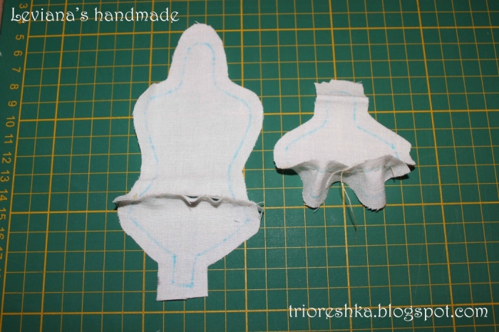 13. Выворачиваем детали. Для длинных тонких деталей удобно пользоваться трубочкой для коктейля и палочкой или тупой спицей. Делается это следующим образом. В отверстие в детали, которую необходимо вывернуть, вставляется длинная трубочка. С противоположного конца детали через ткань потихоньку вставляем палочку или спицу, надевая трубочку на палочку. Когда палочка окажется внутри соломинки, наша деталь окажется вывернутой. Картинок, к сожалению, нет, поскольку в этот раз я не нашла дома трубочек и выворачивала просто с помощью тоненькой палочки. http://img1.liveinternet.ru/images/f...yapiens_14.jpg 14. Прокладываем намётку ниткой швом "вперёд иголка" по линии разметки на внутренней части ноги.