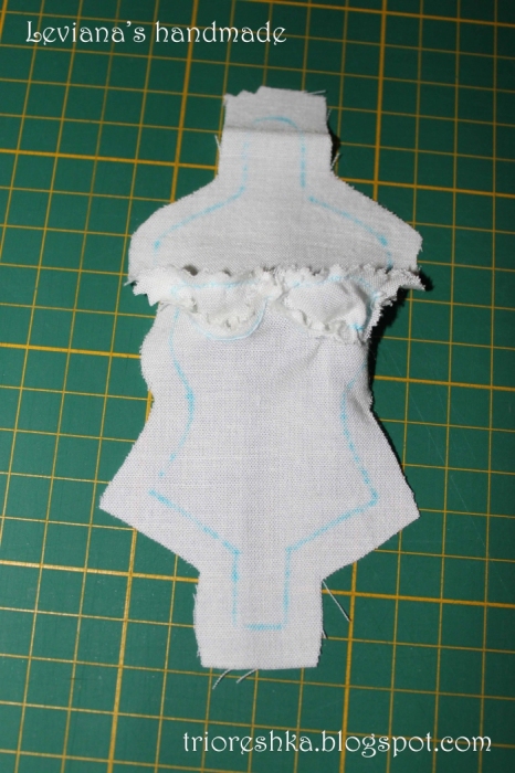 10. Пришиваем снова вручную нижнюю часть переда к верхней, предварительно приметав детали. Обрабатываем "зиг загом" детали груди или снова делаем насечки.