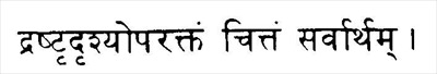драштр-дршйопарактам читтам сарвартхам Таким образом, у ума есть две функции. С одной стороны, он служит Воспринимающему, предоставляя ему информацию о внешнем мире. С другой стороны, он доносит информацию о Воспринимающем до самого себя для своего собственного просветления. 4.24