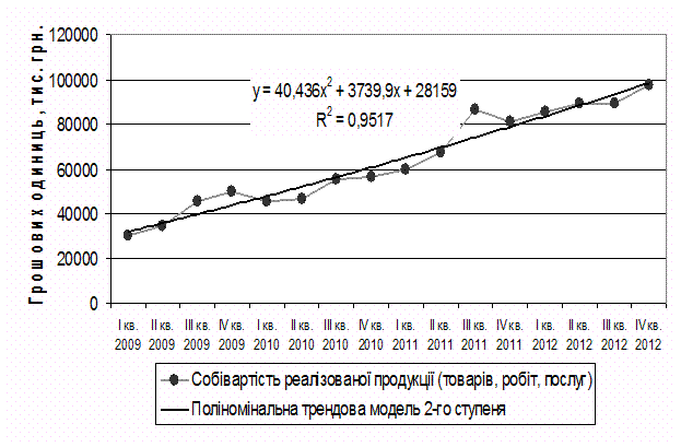 З табл. 3.3 бачимо, що із п’яти ключових видів залежностей (лінійних і нелінійних) коефіцієнта структури активів підприємства від фактора часу найбільш точною є степенева (нелінійна) залежність із коефіцієнтом кореляції 0,8378 і коефіцієнтом детермінації R2 = 0,702, що згідно кали Чеддока вказує на наявність щільного зв’язку між фактором і результативною ознакою. Таким самим чином була проведена перевірка адекватності трендових моделей для показника собівартості реалізованої продукції підприємства, за підсумками якої обрано найбільш вдалий вид залежності, що приймає форму параболи з двома поліномами і характеризується максимальним коефіцієнтом детермінації (рис. 3.2).