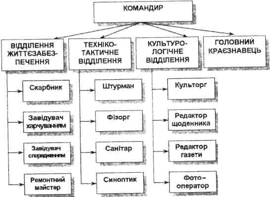 Туристично-краєзнавча діяльність не можлива без організації самоврядування в туристичній групі. Саме цим у значній мірі й обумовлена її педагогічна цінність. Підготовка будь-якого походу вимагає дуже різноманітної і складної роботи. Зрозуміло, що одна людина - керівник групи - не в стані якісно та вчасно все виконати. Тим паче, особа, яка не брала участі у підготовці походу, відчуває себе споживачем роботи інших і не бажає виконувати необхідні дії, спрямовані навіть на удосконалення свого побуту. З педагогічної точки зору, самоврядування дозволяє формувати відчуття відповідальності, взаємозалежності, взаємодопомоги, взаємозахищеності та інші. Виконання роботи, необхідної для інших, сприяє розвитку у школярів доброзичливості, толерантності, готовності прийти на допомогу іншим. З метою створення структури самоврядування на одному з перших занять туристично-краєзнавчого циклу (підготовчий період) проводиться розподіл посад. Кожен учасник походу отримує дві постійні посади - адміністративно-господарську і краєзнавчу. Необхідно стежити за тим, щоб у наступних циклах ті самі учасники мали різні посади. Тим самим ми відмовляємося від підготовки "професіонала" і даємо можливість кожній особі виявити себе в різних сферах діяльності. У кожній туристичній групі обираються: командир, головний краєзнавець, штурман, завідувач харчуванням, завідувач спорядженням, ремонтний майстер, фізорг, санітар, скарбник, синоптик, редактор щоденника і газети, фотооператор, культорг. Якщо в групі більше 14 осіб, три останні посади розділяють або вводяться додаткові посади: заступника командира, завідувача харчуванням, завідувача спорядженням і таке інше. При меншій чисельності групи ряд посад можна об'єднати. Структурно всі обов'язки умовно можна розподілити на три блоки або відділення: відділення життєзабезпечення, техніко-тактичне відділення і культурологічне відділення (див. рис. 5.1).