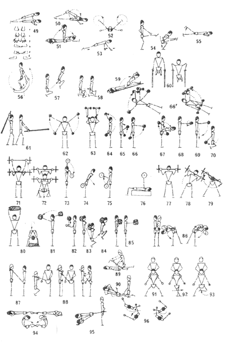 Общие упражнения (см. рисунок) 38) Большой поперечный шпагат, затем наклоны из стороны в сторону, причем нужно лбом касаться коленей. 39) Расставьте ноги так, чтобы внутренние поверхности стоп касались пола; кисти рук на затылке, наклоняйтесь вперед. 40) Лягте на живот, кисти рук на затылке, причем ноги либо придерживает партнер, либо вы используете какой-либо предмет. Прогибаясь назад, как можно больше поднимите корпус, затем поворачивайте грудную клетку вправо, влево. 41) Лягте на живот, соединив кисти рук впереди, стопы также соединены. Раскачивайтесь, поднимая как можно выше то грудную клетку, то ступни. Позвоночник постоянно изогнут. 42) Согнув ноги в коленях, оперевшись руками о пол, сделайте мост. Как можно сильнее прогните позвоночник. 43) Лягте на спину, прижмите руки к полу и выполните «велосипед», подтягивая одно колено к груди, причем другое остается в нескольких сантиметрах от пола. Изменяя положение ног на противоположное, нанесите удар пяткой отведенной перед тем назад ноги, стараясь как бы пробить что-то. Упражнение выполняется в максимальном темпе. 44) Лягте на спину, прижав руки к полу, и поочередно поднимайте стопы, причем ноги должны быть прямыми, стопы поднимаются от пола на несколько сантиметров. Во время выполнения упражнения стопы не касаются пола, упражнение выполняйте медленно, чтобы активно работали мышцы живота. 45) Примите положение для отжимания. Затем выбросьте ноги вперед, между руками, затем вернитесь в исходное положение. В крайних положениях упражнения тело должно быть всегда прямым. 46) Лягте на спину, выполните «березку», затем опустите ноги назад, коснувшись пола пальцами ног (за головой). Опишите соединенными ногами дугу, возвращая их вперед; немедленно коснитесь лбом коленей, сгибая туловище. Ноги постоянно прямые, коленные суставы блокированы.