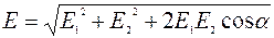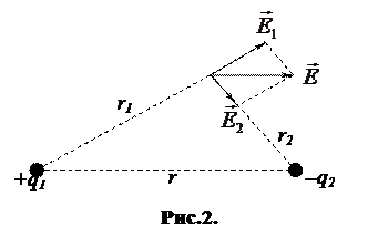 Приклад 2. Електричне поле створене двома точковими зарядами Розв’язання. Напруженість E електричного поля в шуканій точці може бути знайдена як геометрична сума напруженостей E1 та E2 полів, створюваних кожним зарядом окремо (рис. 2):