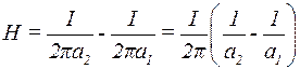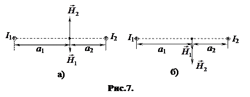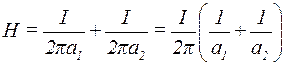 де Н1 − напруженість поля, створеного струмом І1, Н2 − струмом І2. Оскільки Н1 та Н2 напрямлені по одній прямій, то геометрична сума може бути замінена алгебраїчною сумою Для випадку а)