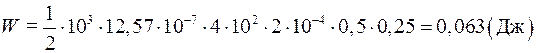 Приклад 6. На залізний стержень (m = 10 3) довжиною 50 см і перерізом 2 см2 намотаний в один шар провідник так, що на кожен сантиметр довжини стержня припадає 20 витків. Визначити енергію магнітного поля в сердечнику соленоїда, якщо сила струму в обмотці 0,5 А.