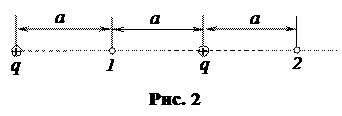 26. Електричне поле створене двома однаковими позитивними точковими зарядами q. Знайти роботу А12 сил поля з переміщення заряду q1 = 10 нКл з точки 1 та потенціалом j1 = 300 В у точку 2 (рис. 2). 27. Знайти потенціальну енергію Еп трьох точкових зарядів q1 = 10 нКл, q2 = 20 нКл і q3 = -30 нКл, розташованих у вершинах рівностороннього трикутника зі стороною а = 10 см. 28. Точкові заряди q1 = 1 мкКл, q2 = 0,1 мкКл знаходяться на відстані r1 = 10 см один від одного. Яку роботу А здійснюють сили поля, якщо другий заряд, відштовхуючись від першого, віддалиться від нього на відстань: 1) r2 = 10 м; 2) r3 =