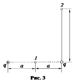 30. Визначити роботу А12 з переміщення заряду q1 = 50 нКл з точки 1 в точку 2 (рис. 3) у полі, яке створене двома зарядами модуль