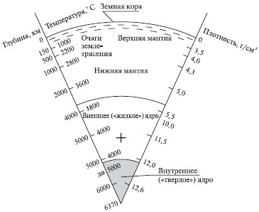 Если бы Земля была однородным телом, то сейсмические волны распространялись бы с одинаковой скоростью, прямолинейно и не отражались. В действительности же скорость волн неодинакова и изменяется скачкообразно. Так, на глубине около 60 км их скорость «неожиданно» увеличивается с 5 до 8 км/с. На отметке 2900 км она возрастет до 13 км/с, затем вновь падает до 8 км/с. Ближе к центру Земли зафиксировано возрастание скорости продольных волн до 11 км/с. Поперечные волны глубже 2900 км не проникают. Резкое изменение скорости сейсмических волн на глубинах 60 и 2900 км позволило сделать вывод о скачкообразном увеличении плотности вещества Земли и выделить три ее части – литосферу, мантию и ядро. Поперечные волны проникают до глубины 4000 км и затухают, что свидетельствует о том, что ядро Земли неоднородно по плотности и внешняя его часть «жидкая», а внутренняя представляет собой твердое тело (рис. 18).