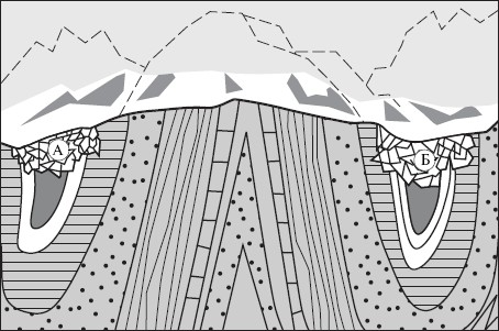 Наукой установлено, что более 2,5 млрд лет назад планета Земля была полностью покрыта океаном. Затем под действием внутренних сил началось поднятие отдельных участков земной коры. Процесс поднятия сопровождался бурным вулканизмом, землетрясениями, горообразованием. Так возникли первые участки суши – древние ядра современных материков. Академик В. А. Обручев называл их «древним теменем Земли». Как только суша поднялась над океаном, на поверхности ее начали действовать внешние процессы. Горные породы разрушались, продукты разрушения сносились в океан и накапливались по его окраинам в виде осадочных горных пород. Толща осадков достигала нескольких километров, и под ее давлением океанское дно начинало прогибаться. Такие гигантские прогибы земной коры под океанами называют геосинклиналями. Образование геосинклиналей в истории Земли идет непрерывно с древнейших времен по настоящее время. В жизни геосинклиналей различают несколько стадий: – эмбриональная – прогиб земной коры и накопление осадков (рис. 28, А); – созревания – заполнение прогиба осадками, когда толща их достигает 15–18 км и возникает радиальное и боковое давление; – складчатости – образование складчатых гор под давлением внутренних сил Земли (процесс этот сопровождается бурным вулканизмом и землетрясениями) (рис. 28, Б); – затухания – разрушение возникших гор внешними процессами и образование на их месте остаточной холмистой равнины (рис. 28).