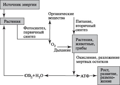 Обмен веществ как основное свойство организмов. Организм находится в сложных взаимоотношениях с окружающей средой. Из нее он получает пищу, воду, кислород, свет, тепло. Создавая посредством этих веществ и энергии массу живого вещества, строит свое тело. Однако, используя эту среду, организм благодаря своей жизнедеятельности одновременно и воздействует на нее, изменяет ее. Следовательно, главным процессом взаимосвязи организма и среды является обмен веществ и энергией. Типы обмена веществ. Факторы внешней среды имеют различное значение для разных организмов. Растениям для роста и развития необходимы свет, вода и углекислый газ, минеральные вещества. Животным и грибам такие условия недостаточны. Им необходимы питательные органические вещества. По способу питания, источнику получения органических веществ и энергии все организмы делятся на автотрофные и гетеротрофные. Автотрофные организмы синтезируют органические вещества в процессе фотосинтеза из неорганических (углекислого газа, воды, минеральных солей), используя энергию солнечного света. К ним относятся все растительные организмы, фотосинтезирующие цианобактерии. К автотрофному питанию способны и хемосинтезирующие бактерии, использующие энергию, которая выделяется при окислении неорганических веществ: серы, железа, азота. Процесс автотрофной ассимиляции осуществляется за счет энергии солнечного света или окисления неорганических веществ, а органические вещества синтезируются при этом из неорганических. В зависимости от поглощения неорганического вещества различают ассимиляцию углерода, ассимиляцию азота, ассимиляцию серы и других минеральных веществ. Автотрофная ассимиляция связана с процессами фотосинтеза и хемосинтеза и носит название первичного синтеза органического вещества. Гетеротрофные организмы получают готовые органические вещества от автотрофов. Источником энергии для них является энергия, запасенная в органических веществах и выделяющаяся при химических реакциях распада и окисления этих веществ. К ним относятся животные, грибы, многие бактерии. При гетеротрофной ассимиляции организм поглощает органические вещества в готовом виде и преобразует их в собственные органические вещества за счет энергии, содержащейся в поглощенных веществах. Гетеротрофная ассимиляция включает процессы потребления пищи, переваривания ее, усвоения и синтеза новых органических веществ. Этот процесс носит название вторичного синтеза органических веществ. Процессы диссимиляции у организмов также различаются. Одним из них для жизнедеятельности необходим кислород – это аэробные организмы. Другим кислород не нужен, и процессы их жизнедеятельности могут протекать в бескислородной среде – это анаэробные организмы. Большинство организмов являются аэробными. Это все растения, животные (за исключением некоторых паразитов), основная часть грибов и бактерий. Дыхание для них является главной формой диссимиляции. При дыхании богатые энергией органические вещества полностью окисляются до энергетически бедных веществ – углекислого газа и воды. В этих процессах используется молекулярный кислород, который образуется в процессе фотосинтеза, т. е. автотрофной ассимиляции. Этот процесс носит название биологического окисления. Различают внешнее дыхание и внутр