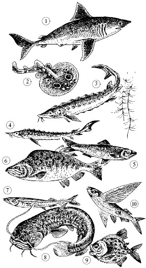 Рис. 86. Рыбы. Хрящевые: 1 – акула сельдевая; 2 – электрический скат; костно-хрящевые: 3 – осетр; 4 – стерлядь; костистые: 5 – сельдь атлантическая; 6 – горбуша; 7 – сайра; 8 – сом; 9 – пиранья; 10 – летучая рыба Date: 2015-09-22; view: 3536; Нарушение авторских прав |
