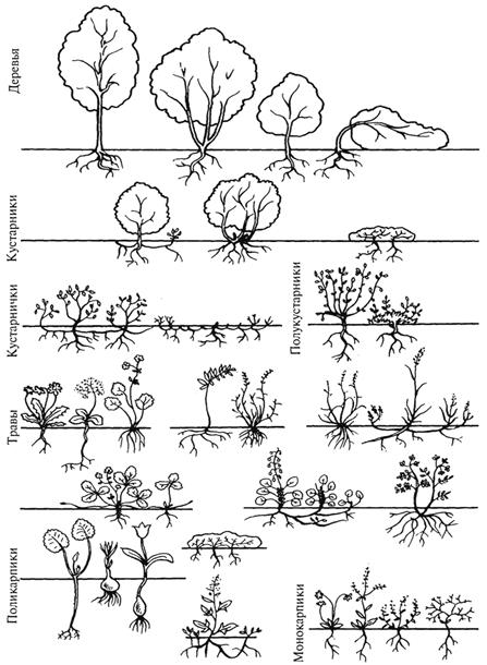 Рис. 4. Классификация жизненных форм покрытосеменных растений (по И.Г. Серебрякову, 1964)