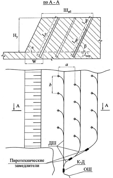 Длина заряда ВВ в скважине l зар = L c – l заб , м, где l заб – длина забойки, м: l заб = (15÷20) d с, м Вместимость скважины должна быть равна или близка расчетной массе заряда. Если они существенно отличаются друг от друга, то привести их в соответствие возможно за счет некоторого увеличения или уменьшения размеров сетки скважин (а ´ b) или за счет рассредоточения заряда ВВ по высоте и уменьшения в результате его массы (по материалам лекций). 6. Выбор формы сетки скважин Количество рядов скважин при расчетах предварительно возможно принимать, исходя из общей ширины взрываемого блока (Ш вб) в пределах 15-30м. Форму сетки скважин следует принимать в соответствии с величиной угла αув: при αув = 60-90о и αув =0-30о наилучшей будет шахматная форма сетки, а при αув от 30о до 60о – прямоугольная. 7. Определение выхода горной массы с 1м скважины. Примерное его значение вычисляется по выражению:
