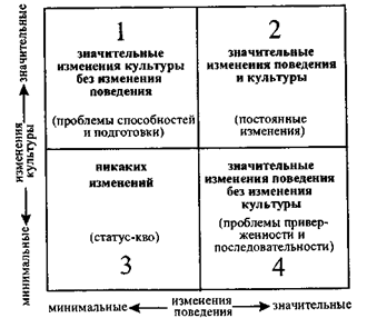 С течением времени и под воздействием обстоятельств культура может претерпевать изменения. Поэтому важно знать, как проводить изменения такого рода. Методы изменения культуры организации созвучны рассмотренным выше методам поддержания культуры. Это: 1) изменение объектов и предметов внимания со стороны менеджера; 2) изменение стиля управления кризисом или конфликтом; 3) перепроектирование ролей и изменение фокуса в программах обучения; 4) изменение критерия стимулирования; 5) смена акцентов в кадровой политике; 6) смена организационной символики и обрядности[376]. Следует отметить, что изменения в поведении могут привести к изменениям в культуре, и наоборот. Однако это происходит не неизбежно или автоматически. Это связано с той ролью, которую играет в этом процессе "передача" культуры и обоснование поведения. В зависимости от ситуации связь между изменениями в поведении и культуре в ту или другую сторону может обнаружиться в течение периода, измеряемого от нескольких месяцев до нескольких лет. Поэтому для анализа важно различать изменения культуры и другие организационные изменения и исследовать их одновременно. Существует три возможных сочетания Изменений в поведении и культуре в организации (рис. 8. 1). В случае первого сочетания происходят изменения в культуре без изменений в поведении. В этом случае работники могут изменить одно или несколько верований или ценностей, но при этом они не способны изменить свое соответствующее поведение (квадрант 1). Одни верят, что курить вредно, но не могут бросить курить. В коммерческих организациях люди меняют свое базовое предположение о влиянии внешней среды, однако для изменения поведения им не хватает соответствующих знаний, навыков и умений. Во всех этих и им подобных случаях главной проблемой является то, что люди в организации не обладают способностями и подготовкой, требуемыми для изменения поведения в данных условиях. Как показывает практика, решить эту проблему можно скорее путем научения в организации (учиться на своих ошибках), чем вне ее. Второе сочетание — это изменения поведения без изменений в культуре (квадрант 3). В этом случае один или более членов организации, а может быть даже группа или группы работников могут быть убеждены в том, что организационные изменения должны произойти, хотя при этом отдельные работники могут не хотеть этого. В зависимости от статуса и влиятельности сторонников изменений в организации преобразования могут происходить более или менее успешно. Противники изменений формально будут вынуждены следовать выбранному курсу на изменения и даже примут новые символы, но внутреннее несогласие будет мешать переводу нового в базовые термины организационной культуры (предположения, верования и ценности). Так, сейчас во многих коммерческих организациях работают люди "старой закалки", добросовестно выполняя свою работу на профессиональном уровне в новых условиях, однако при этом сохраняя старое мировоззрение. Главная проблема в такой ситуации — это отсутствие приверженности и последовательности в переводе своего формального поведения в термины новой культуры, образно говоря, в привычку. Люди меняют свое формальное поведение либо из-за боязни потерять получаемую компенсацию, либо получают удовлетворение от умения подстроиться к новому полож