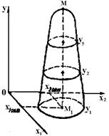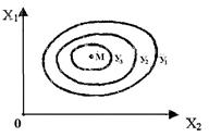 Якщо зробити перетин поверхні відгуку площинами, рівнобіжними площини х10х2, і отримані в перетинах лінії (у1 = соnst, у2= соnst і т.д.) спроектувати на площину хІ0х2, то поверхня відгуку для двофакторного процесу буде зображена на площині (рис. 1.4) аналогічно горизонталям на топографічних картах. Кожна лінія відповідає визначеному значенню параметра оптимізації в і називається лінією рівного відгуку. Точка М на рис. 1.4 є оптимальною точкою, яку ми шукаємо. Оскільки ширий вид функції у = f(х1, х2,х3...хn) невідомий, для опису поверхні відгуку використовують рівняння, що представляє собою розкладання цієї функції в степінний ряд: