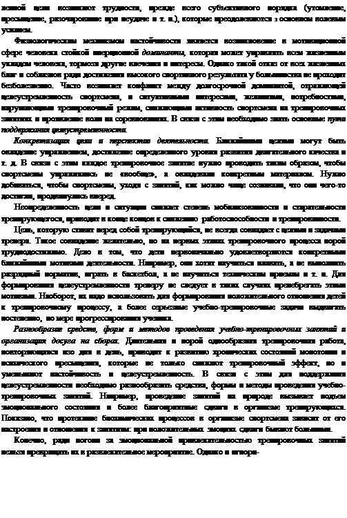 ровать фактор эмоциональности невозможно. Поэтому тренеру нужно, не теряя содержательности занятий, тщательно продумывать чередование средств и методов, способов организации тренировочных занятий. Особо следует остановиться на организации досуга во время учебно-тренировочных сборов. Строгое и в общем-то необходимое соблюдение режима, отказ от элементарных удовольствий и привычек — одно из условий достижения высокого спортивного результата. Однако нередко тренеры перебарщивают в своих требованиях к спортсменам, лишая их нормальных условий жизни, превращая тренировочный сбор в казарму. Происходит это по многим причинам (непонимание спортсменов, неуверенность в их сознательности и ответственности, желание перестраховаться и т. д.). В результате же вольно или невольно тренер сам ухудшает состояние спортсменов, снижает их целеустремленность. Соблюдение принципа доступности. Целеустремленность поддерживается достижением поэтапных целей. В связи с этим для развития волевой сферы личности необходимо предъявлять преодолимые, но требующие определенных усилий трудности. Слишком легкое задание неэффективно для поддержания целеустремленности и воспитания настойчивости. Однако и чрезмерно трудное задание может вызвать чувство разочарования, утрату веры в свои силы. Оптимальная же трудность подстегивает учащихся к большей мобилизации возможностей, бросает вызов самолюбию и стимулирует активность учащихся на преодоление трудности. Важно также стремиться развивать у спортсмена чувство удовлетворения от самого процесса тренировки, пробудить у него интерес к содержанию занятий, стремление к познанию теоретических закономерностей. Тогда процесс тренировки наполнится для него новым содержанием, в нем появятся элементы творчества, и спортсмен не будет воспринимать занятия как малопонятное и однообразное выполнение большой по объему тренировочной работы. В этом случае и неудачи, неизбежные при достижении отдаленной по времени цели, будут переживаться спортсменом не так остро и, следовательно, окажут меньшее отрицательное влияние на целеустремленность. Использование эффекта соперничества. В определенные моменты тренировочного процесса для поддержания целеустремленности и повышения настойчивости целесообразно использовать эффект соперничества. Наиболее простым способом его достижения является использование игрового и соревновательного методов выполнения нагрузок. Можно использовать и другие приемы: например, дать спортсмену почувствовать себя первопроходцем, впервые выполняющим такой-то гимнастический элемент, или стимулировать спортсмена на лучшие результаты, сравнивая его деятельность с деятельностью уже добившихся успехов спортсменов. Повышение мотива такими способами увеличит настойчивость, создаст новый эмоциональный заряд для поддержания целеустремленности. Формирование у спортсмена чувства долга и ответственности. При недостаточном развитии у спортсмена чувства долга настойчивость может не обнаружиться в полной мере. Правда, ее проявление возможно и при эгоистических устремлениях спортсмена (корыстолюбии, чрезмерном честолюбии), однако вряд ли такая целеустремленность и проявление настойчивости будут радовать педагога.