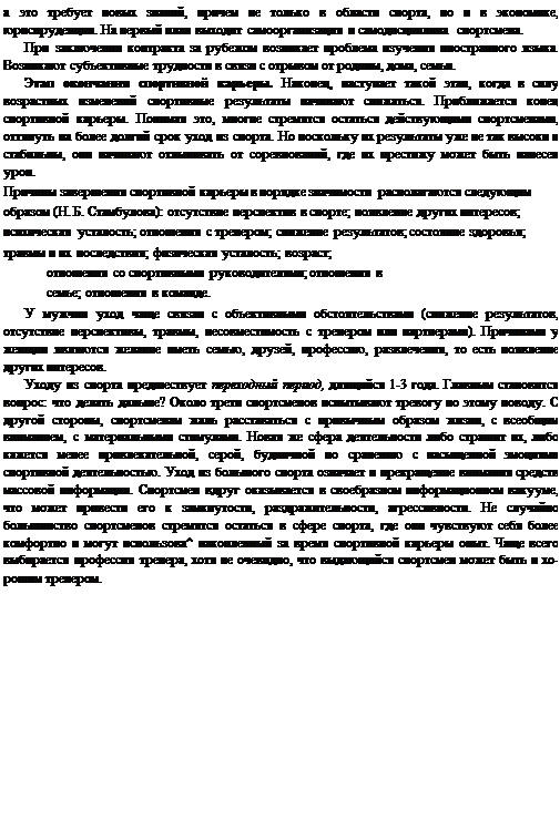 Около трети спортсменов тяжело переживают уход из спорта. Возникает много новых проблем (появилось свободное время, которое некуда девать, нужно самостоятельно решать вопросы., связанные с изменением образа жизни, необходимо снова завоевывать авторитет, высокий социальный статус в новой сфере деятельности (профессии) и т. п.). Те, кто учится, могут испытывать дискомфорт от того что имеются пробелы в базовом образовании, нет привычки к умственной работе, что не могут заставить себя сосредоточиться, не могут самостоятельно планировать свою работу, что психологически трудно догонять в учебе сверстников, которые ушли вперед. Ольга Корбут, олимпийская чемпионка по спортивной гимнастике: «Когда 12 лет назад я ушла из спорта, то разом иу просто в одночасье, перестала быть кому-либо интересна и нужна. <...> Свадьба, рождение сына только приглушили бель и отчаяние, загнали внутрь страшный еонрос: ка«<ж**ть дальше? Отвечать на него можно было не сразу. И я это "потом" все ег.-го^залз, с тодвигаез, ка:-. могла. Только бесконечно так продолжаться не могло. <...> Через некоторое время с меня сняли стипендию и назначили на должность гостренера по гимнастике. <...> Работы я не боялась, жаждала ее, какие-то правильные или неправильные шаги предпринимала. Только меня по рукам били и ни к чему серьезному ке подпускали. <...> А я хотела делать то, что мне по силам, к чему предрасположена, что дается легко и в удовольствие и пользу приносит всем. <...> И не было бы моих болячек и стрессов, безысходности и унижений. <...> Кажется, у меня еше и сейчас не завершился этот ужасный переходный период из спорта в нормальную жизнь». Советский спорт. 1989 9 марта Острота протекания кризиса, связан кого с уходом из спорта, усиливается при внезапном уходе, отсутствии предварительной подготовки к нему, пассивной позиции спортсмена, отсутствии материальной и психологической поддержки. Затрудняют адаптацию к новому образу жизни такие свойства личности, как обидчивость, упрямство, тревожность, нерешительность, застенчивость и пассивность. В этот период спортсмены особенно нуждаются в психологической помощи и поддержке родных и друзей.