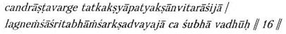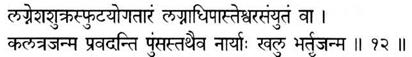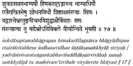 Число жен или женщин, с которыми владелец гороскопа будет иметь связи, может быть получено сложением цифр после сокращения в знаках, занятых хозяевами 7-го и 9-го домов, считая от Венеры и планет, владеющих 9-ми домами, считая от Луны и лагны соответственно. Другой способ - через цифры после сокращения в знаках экзальтации, а также ослабления планеты, владеющей 7-м домом - они будут соответствовать количеству браков владельца гороскопа. Если имеется различие между двумя этими результатами, должен приниматься во внимание более низкий, если хозяин 7-го дома слаб, тогда как более высокий должен учитываться, когда хозяин 7-го дома очень силен. Комментарии Следует сложить цифры знаков, соответствующих порядковому номеру от Овна, в которых располагаются хозяева 7-го и 9-го домов от Венеры и цифры знаков, владеющих 9-ми домами от Луны и лагны. Сокращение - это вычитание 12-ти знаков, если результат получается больше. Второй метод - сложение цифр знаков экзальтации и ослабления планеты, владеющей 7-м домом и сокращение результата на 12. Принимается во внимание более низкий результат, если хозяин 7-го дома слаб, а высокий результат - если хозяин 7-го дома силен. Примечание. В эпоху Кали-юги число браков и число связей могут не соответствовать друг другу, поэтому данный расчет, как показывает практика, становится трудиоприменимым. Шлока 18