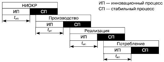 В деятельности каждой организации на любой стадии жизненного цикла изделия (ЖЦИ) сочетаются стабильный и инновационный процессы. Оба процесса взаимно дополняют друг друга: состояние стабильного процесса определяет инновационные задачи, а результаты инновационной деятельности реализуются в стабильном процессе (рис. 2.1).