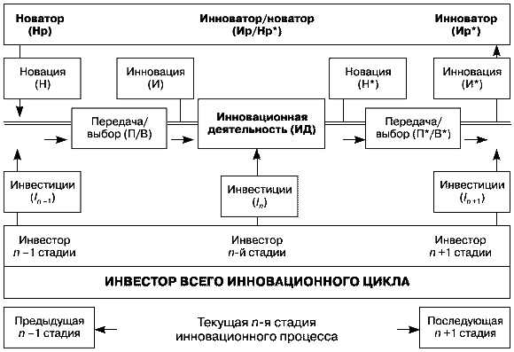 Рис. 2.4. Стадии жизненного цикла изделий и их последовательность В каждой стадии ЖЦИ есть много общего по форме и структуре компонентов, а также структуре инновационного процесса. На рис. 2.5 представлена схема отдельной стадии цикла инновационного процесса: 1) новация или, как чаще говорят, новшество (Н), созданное новатором на предыдущей стадии, поступает через рынок (операция «выбор» - В) или плановый механизм (операция «передача» - П) на рассматриваемую нами стадию; 2) принятая для реализации новация (новшество) становится инновацией (нововведением) - «И». Организация осуществляет инновационную деятельность и на данный период времени предстает перед нами в качестве инноватора; 3) в результате инновационного процесса организацией создано новшество (новация -Н*). И фирма, теперь уже в качестве новатора, предлагает (передает) потребителю через рынок (операция «выбор» - В*) или через плановый механизм (операция «передача» - П*) свою новинку - инновацию (И*) следующему по циклу инноватору.
